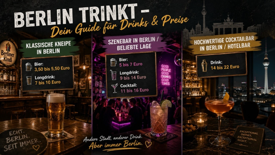 Berlin bietet dabei ein breites Preisniveau. In traditionellen Kneipen bleibt vieles noch moderat. In Szenevierteln oder designorientierten Bars steigen die Preise deutlich. Durchschnittliche Getränkepreise wären: